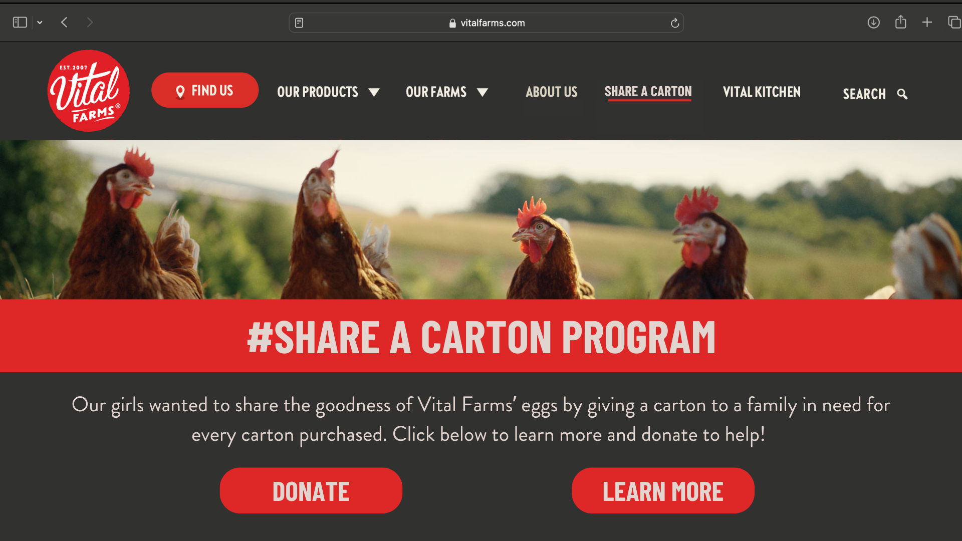 The website landing page which describes the campaign objective. Positioning Vital Farms as a brand that continues to extend it's mission of caring for people, animals and our communities.